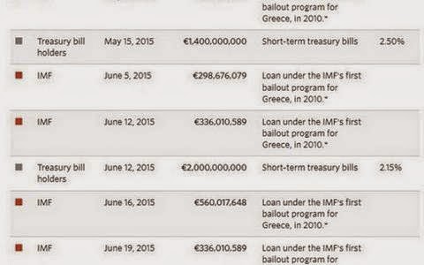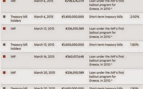 Σύμφωνα με την Wall Street Journal που έκανε τους λογαριασμούς, ο Γολγοθάς ξεκινά τις επίμενες ημέρες καθώς από 6 Μαρτίου έως 8 Μαΐου, πρέπει να πληρωθούν 10.378.729.024 ευρώ. Από 12 Μαΐου έως 20 Ιουλίου, πρέπει να πληρωθούν 11.606.843.685 ευρώ. Τέλος, από 7 Αυγούστου έως 21 Δεκεμβρίου, πρέπει να πληρωθούν 7.361.733.340 ευρώ. Συνολικά δηλαδή χρέος 29 δις ευρώ πρέπει να πληρωθεί μέχρι το τέλος του 2015.